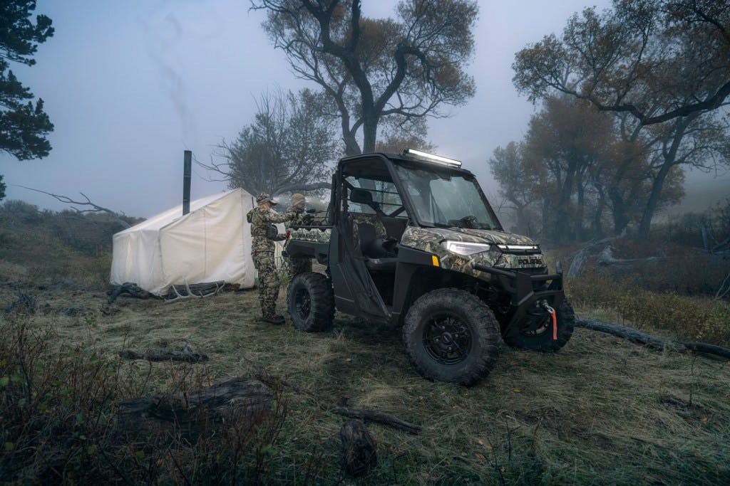 2024 Polaris Ranger Kinetic EV in a foggy field with a tent