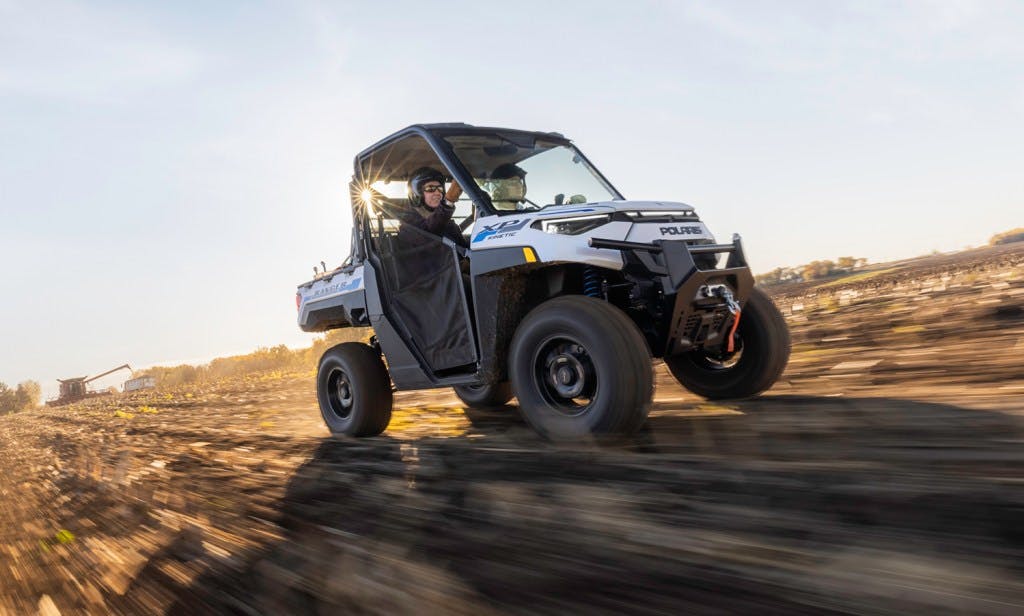 2024 Polaris Ranger Kinetic EV running through a field with the sun behind it