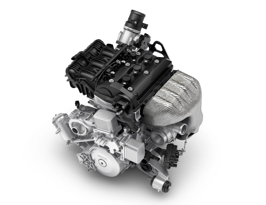 Too much for some. Not enough for others. Just right, if you ask us. The Mav R’s turbocharged 1.0-liter triple makes 240 hp. That engine is a stone-cold badass: forged pistons, plasma-coated cylinders, an intercooler, two radiators, a closed-deck block, a dry-sump oiling system. It’s mated to a beltless, low-maintenance, paddle-shifted seven-speed Rotax twin-clutch automatic transmission.