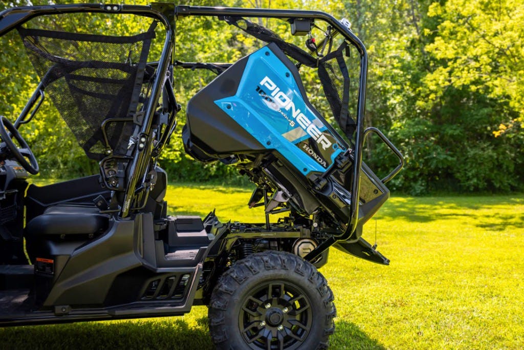 The defining feature of the Pioneer 1000-5 is the aforementioned dump bed layout. Because the two rear seats are fully integrated into the bed itself, Honda was able to retain the Pioneer’s hydraulic dumping feature without compromising any space in the bed itself.