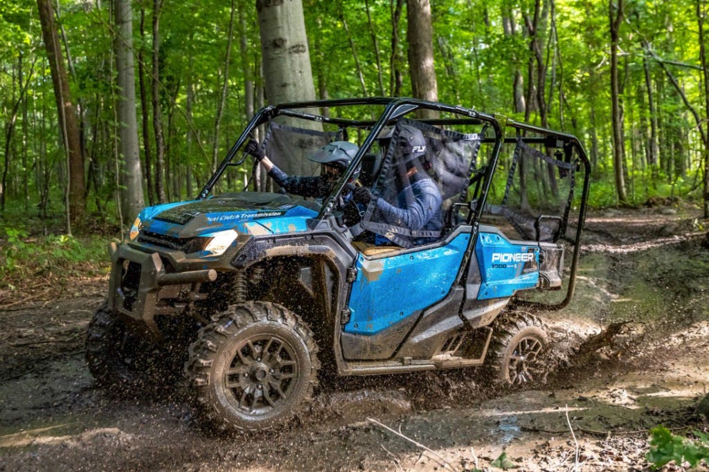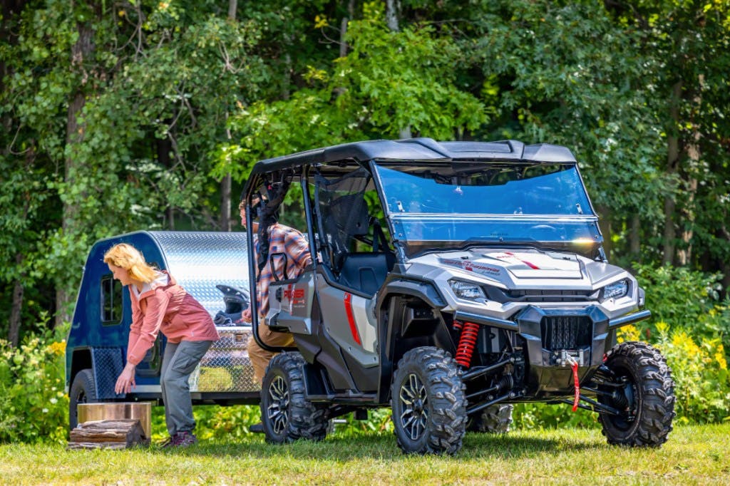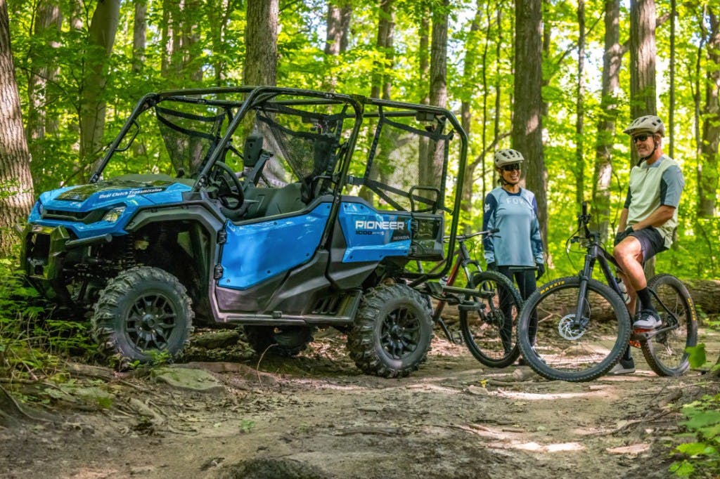 Honda currently offers the Pioneer 1000-5 in three trim levels. There’s the base model, a Deluxe model with aluminum wheels and color-matched door panels, and then there’s a “Trail Special Edition,” which gets fancier wheels still, a 4,500-pound Warn winch, a windshield, a roof, factory audio, and Fox QS-3 suspension.